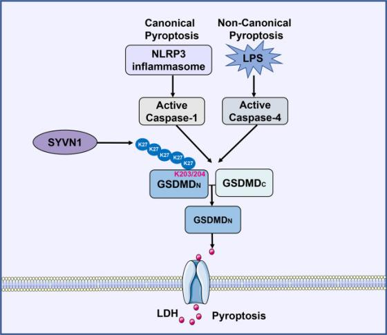 这篇文章的作者基于GSDM可以诱导细胞焦亡,从生物特征以及功能上去揭示GSDMD翻译后修饰的功能和机制,如泛素化、去泛素化和磷酸化,是否参与细胞焦亡。由于泛素化可以调控炎症反应,作者初步假设GSDMD可以通过泛素化来促进细胞焦亡。其他内在调控因子做介导,并选定SYVN1作为研究对象,证实其可以靶向泛素化。