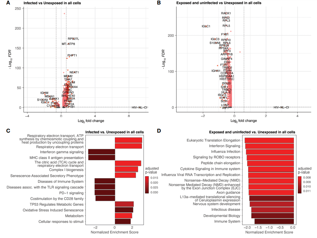 作者将实验组分为HIV暴露与未暴露两组,并测定了暴露后感染与未感染细胞分群中各类细胞的占比。火山图显示了感染细胞和未感染细胞之间基因表达的倍数变化。